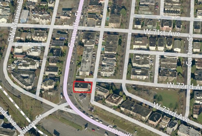 The subject property is located in Marpole on the southeast corner of Granville Street between West 72nd Avenue and South West Marine Drive in Vancouver, B.C.